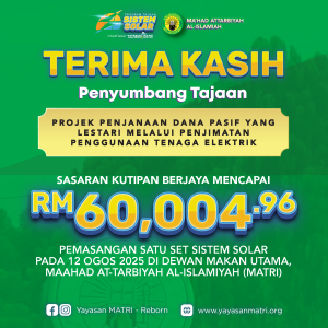 Dana ini telah digunakan untuk pemasangan satu set sistem solar di Dewan Makan Utama, Ma’had At-Tarbiyah Al-Islamiyah (MATRI) pada 12 Ogos 2025.