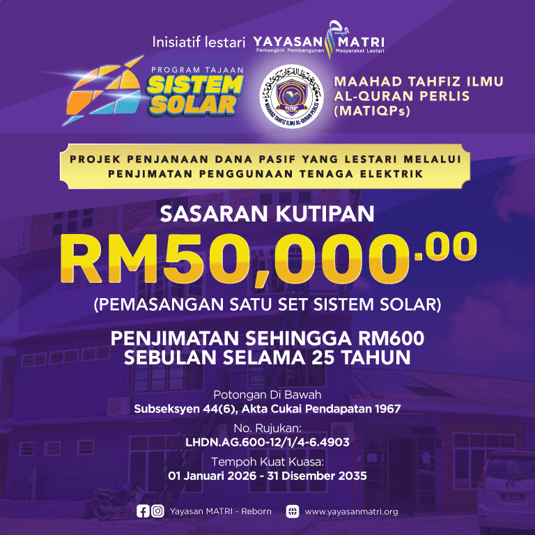 Oleh itu, pihak Maahad dengan kerjasama Yayasan MATRI mengadakan kempen pengumpulan dana untuk memasang panel solar bagi memberi penjimatan sehingga RM600 sebulan serta menghasilkan tabungan simpanan berjumlah RM180,000.00 kepada pihak Ma’ahad.