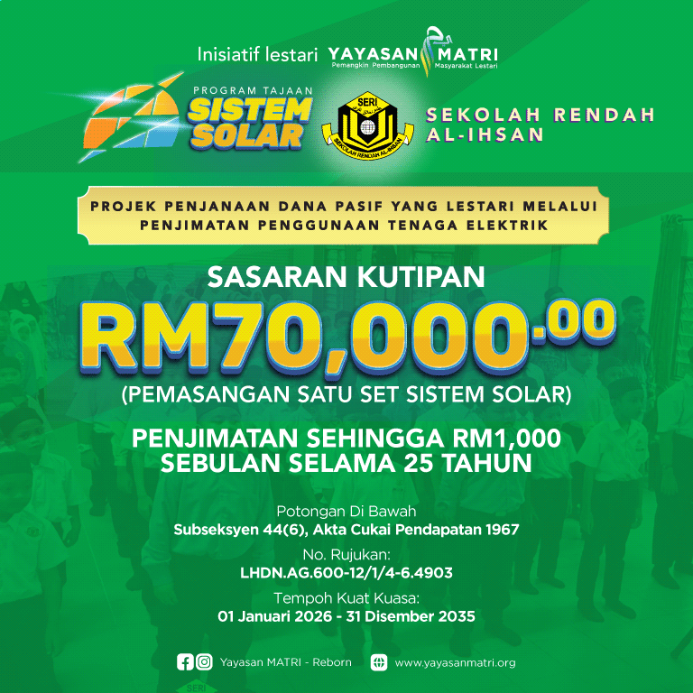 Oleh itu, pihak Sekolah Rendah Al-Ihsan dengan kerjasama Yayasan MATRI mengadakan kempen pengumpulan dana untuk memasang panel solar bagi memberi penjimatan sehingga RM1,000* sebulan serta menghasilkan tabungan simpanan berjumlah RM500,000.00* kepada pihak Sekolah Rendah Al-Ihsan.