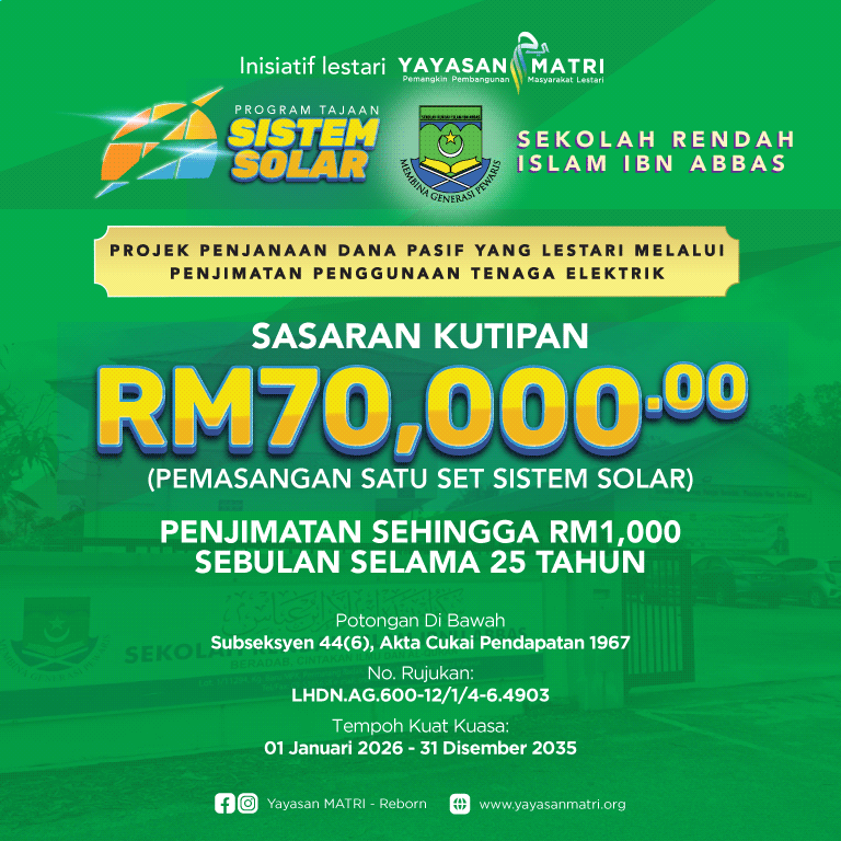 Oleh itu, pihak Sekolah Rendah Islam Ibn Abbas dengan kerjasama Yayasan MATRI mengadakan kempen pengumpulan dana untuk memasang panel solar bagi memberi penjimatan sehingga RM1,000* sebulan serta menghasilkan tabungan simpanan berjumlah RM500,000.00* kepada pihak Sekolah Rendah Islam Ibn Abbas.